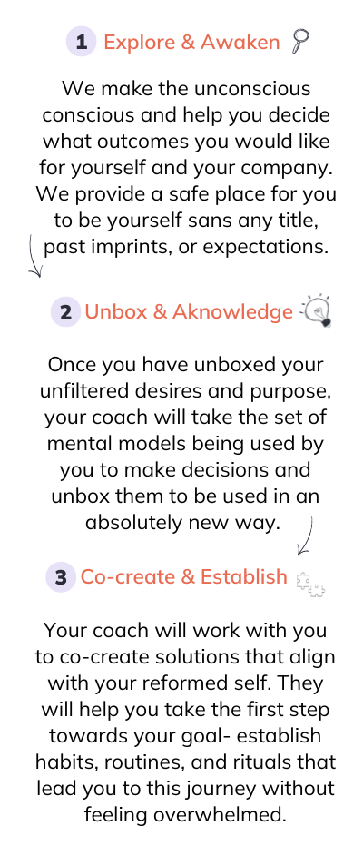 Our coaching process helps you take a step back, re-evaluate and put things into perspective. Kind of like training for a higher altitude. We’ll help you channelise your energy to the right place, which in turn will help you overcome the loss of productivity and confusion. In short, you’ll re-learn how to keep breathing.